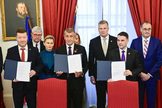 Podpis koaliční smlouvy vlády (ANO, SPD, Motoristé) dne 3. listopadu 2025. Vpředu zleva předseda SPD Tomio Okamura, předseda ANO Andrej Babiš a předseda Motoristů Petr Macinka | fotografie: Vít Šimánek, ČTK | licence: Profimedia.cz